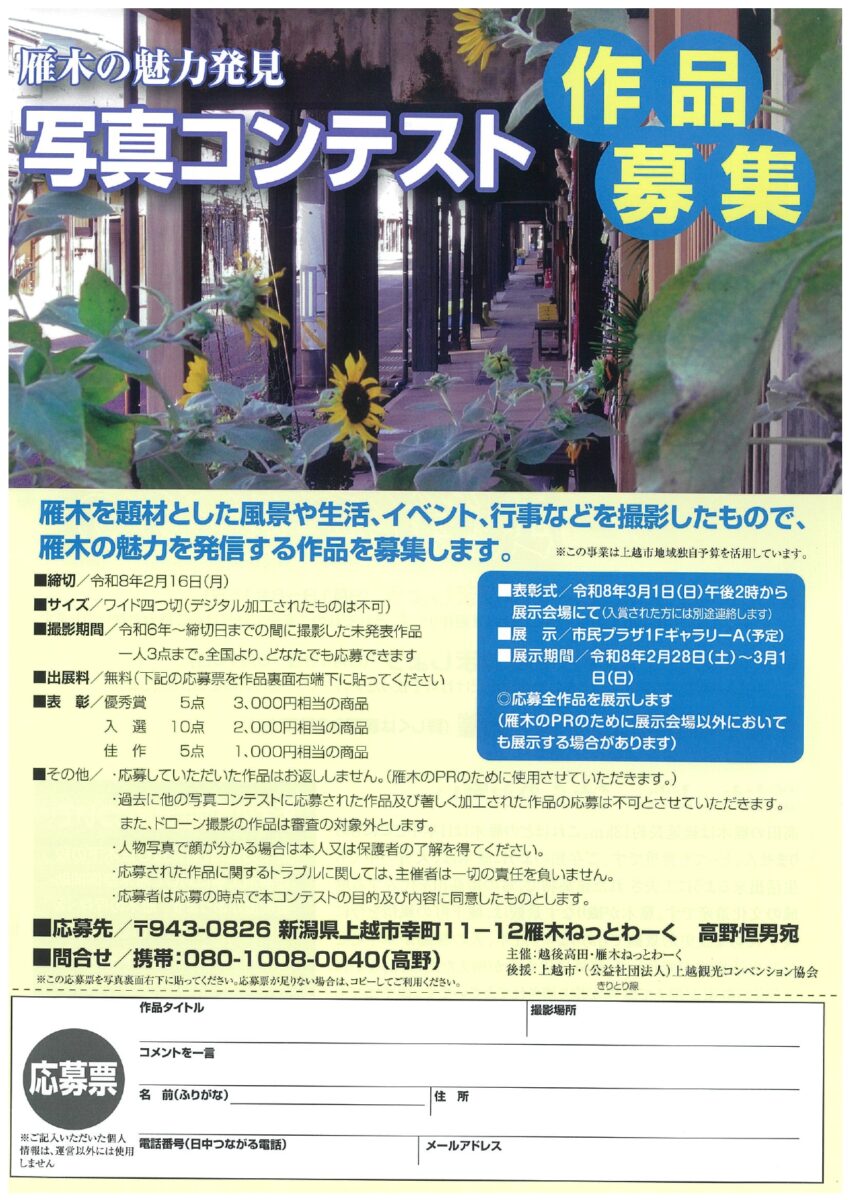 直江津の風景やイベント、文化資産など直江津の魅力を写真にしてみませんか。サイズ/ワイド四つ切 応募点数/一人3点まで撮影期間/令和6年〜締切日までの間に撮影し…続きを読む