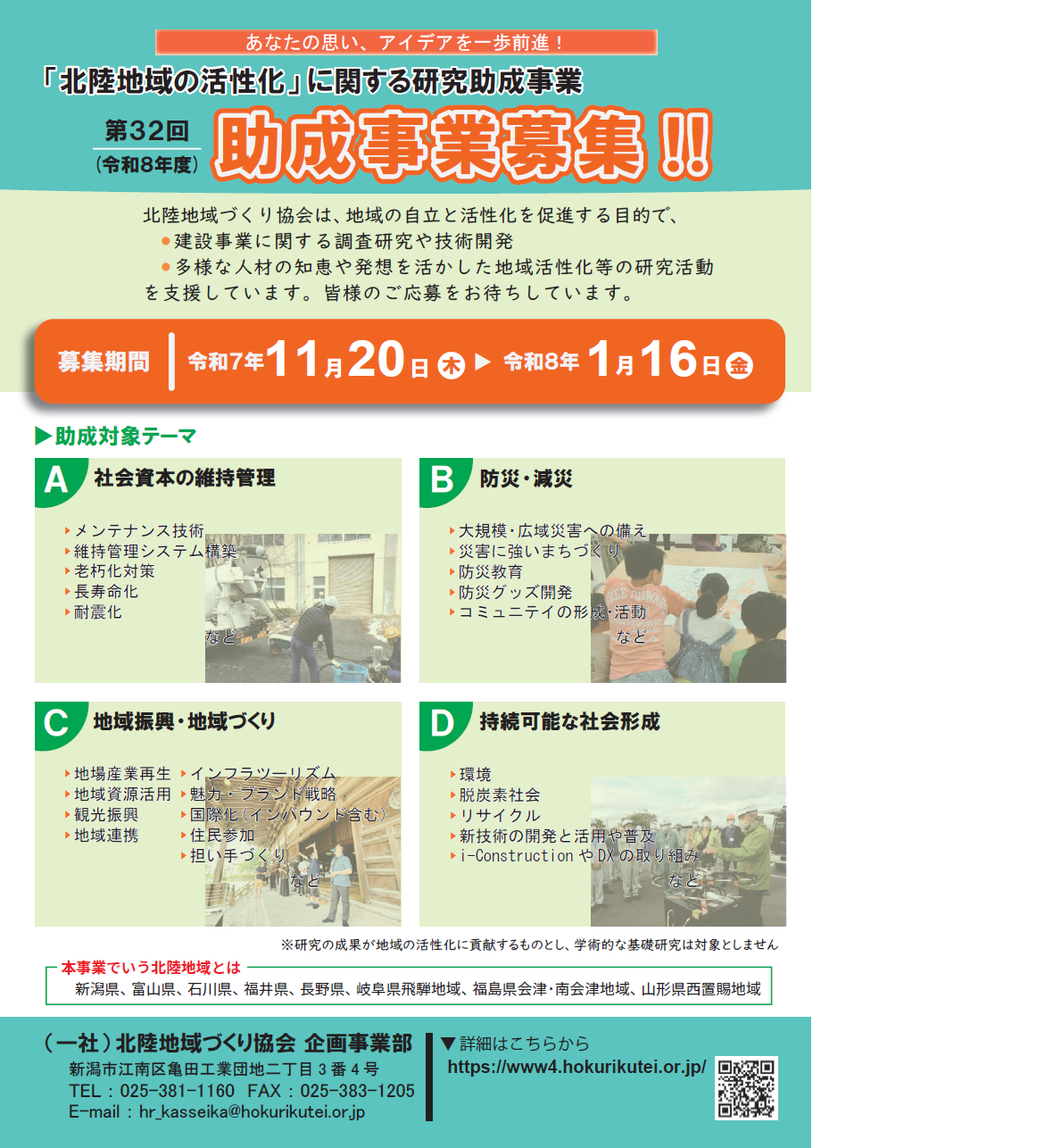 地域に住む人々の英知や発想を活かした多様な研究や活動を支援します。 助成対象テーマ/A 社会資本の維持管理 メンテナンス技術、維持管理システム構築、老…続きを読む