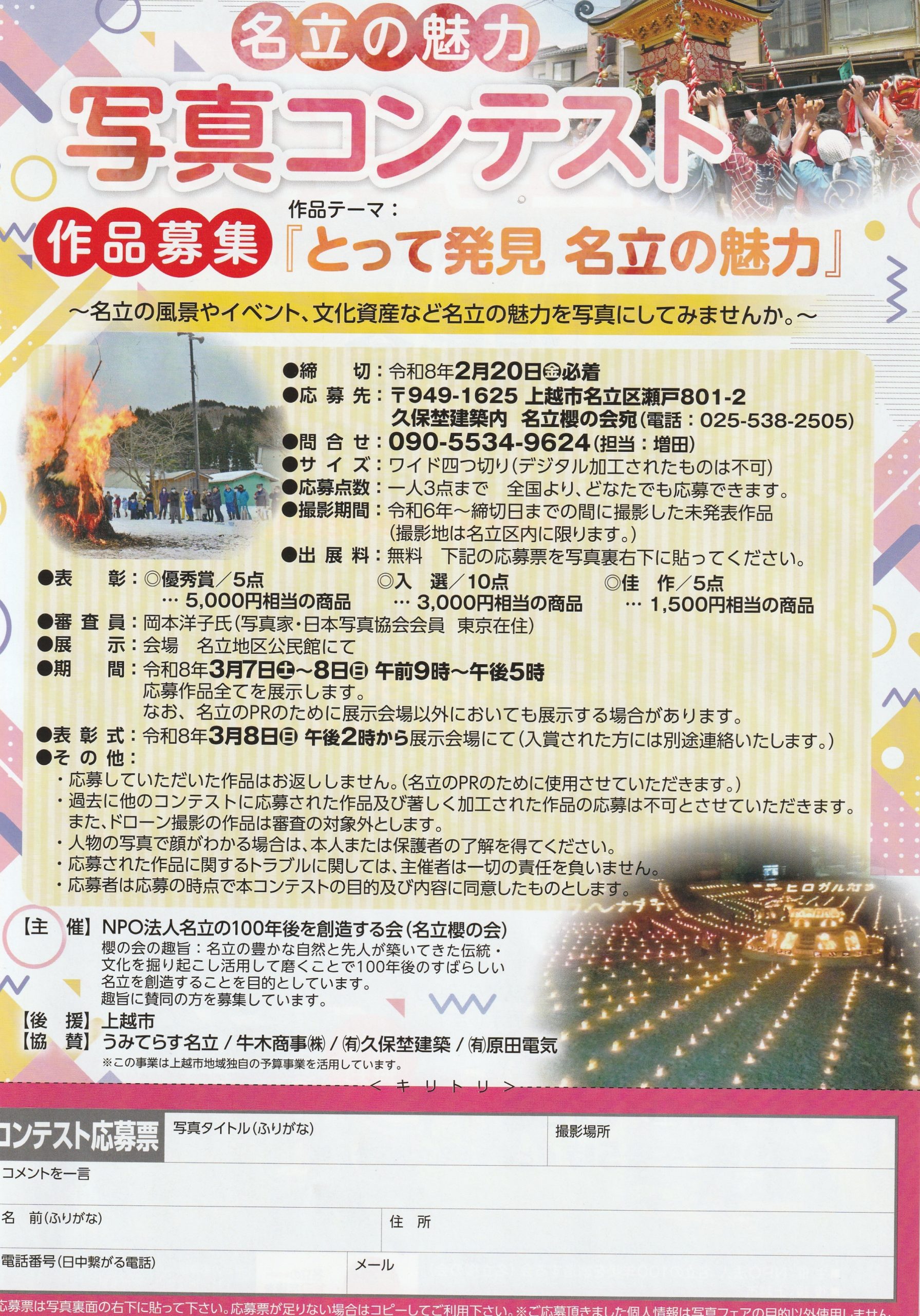 「撮って発見名立の魅力」をテーマにイベント、文化資産など名立の魅力を撮影した写真を募集します。作品テーマ/「撮って発見名立の魅力」サイズ/ワイド四つ切り(デジ…続きを読む