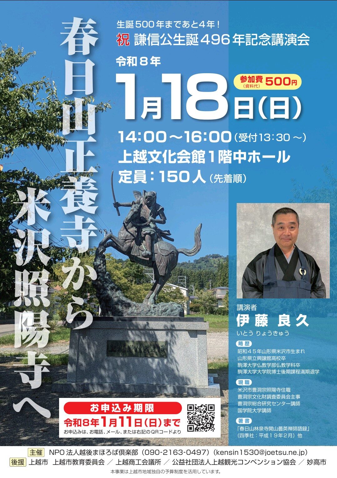 1月21日は越後の英雄上杉謙信公の生誕日です。生誕500年まであと4年となる令和8年の生誕日を前に「祝 謙信公生誕496年記念講演会」を行います。日時/1月1…続きを読む