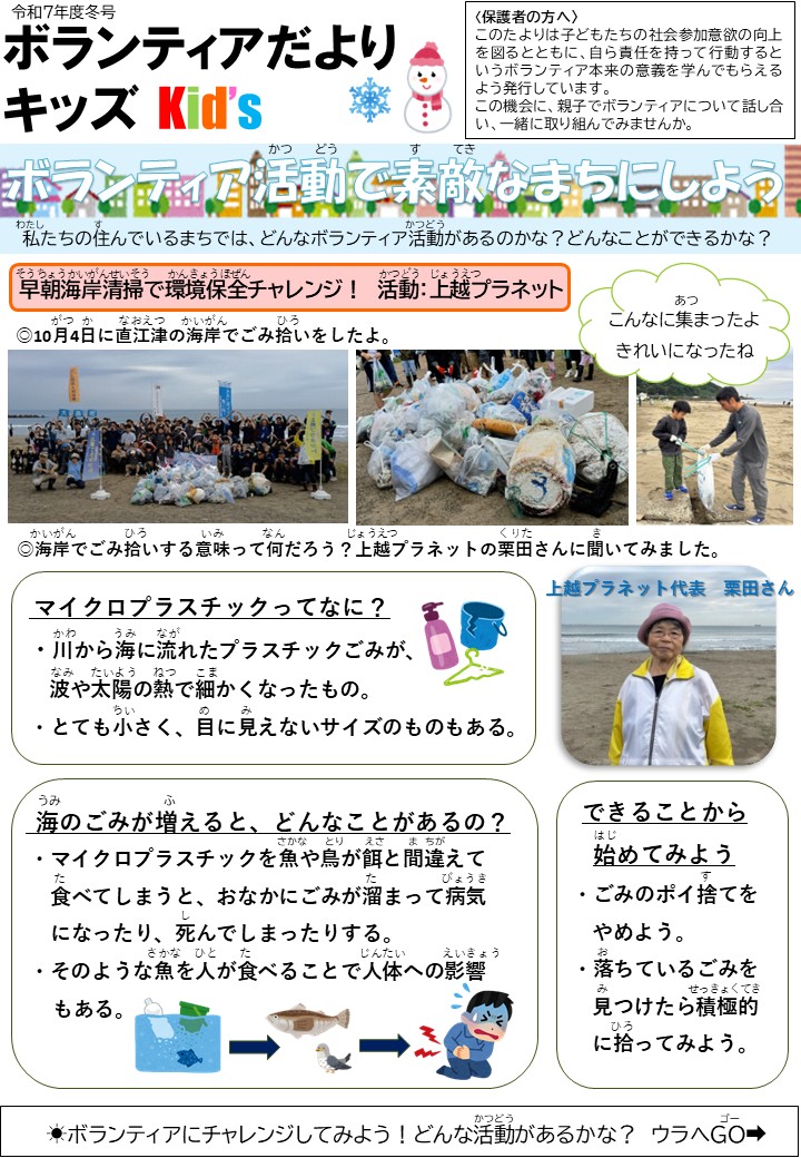 ~ボランティアだよりKid’s冬号を発行しました~このたよりは子どもたちの社会参加意欲の向上を図るとともに、自ら責任を持って行動するというボランティア本来の意…続きを読む