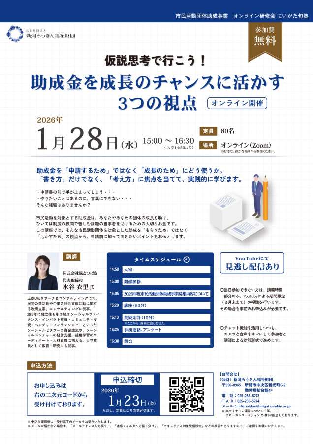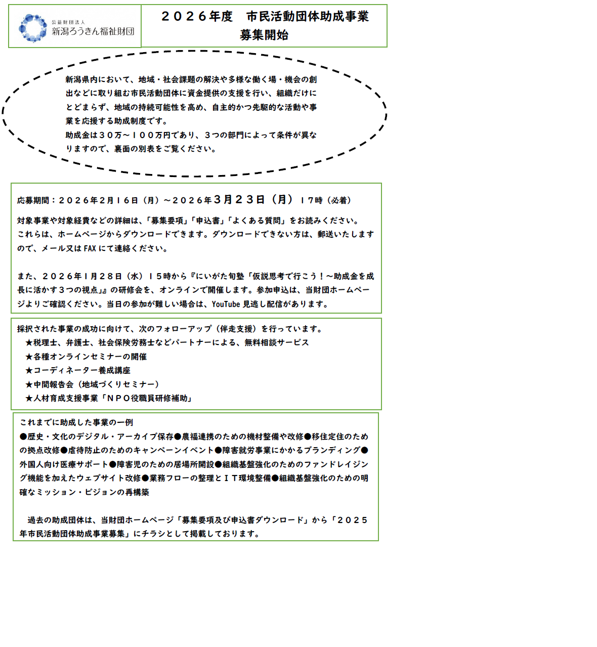 新潟県内において、様々な地域課題・社会課題の解決や、多様な働く場・機会の創出などに取り組む市民活動団体を支援するため資金提供を行い、組織だけにとどまらず、地域…続きを読む