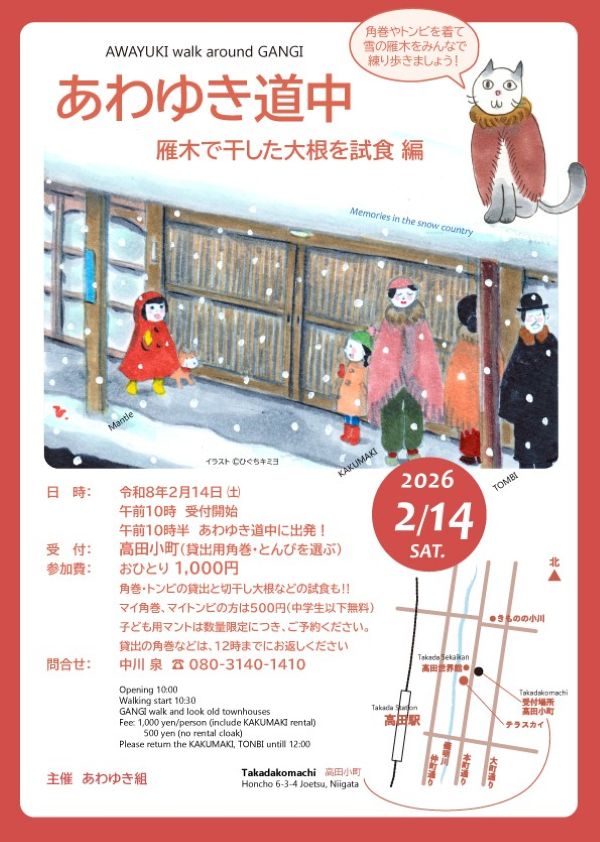 角巻やトンビ着て町家の内部を見学し、雁木通りを練り歩き、干した切り干し大根を使った料理を食べましょう。 日時/2月14日(土)10:00受付、10:30…続きを読む