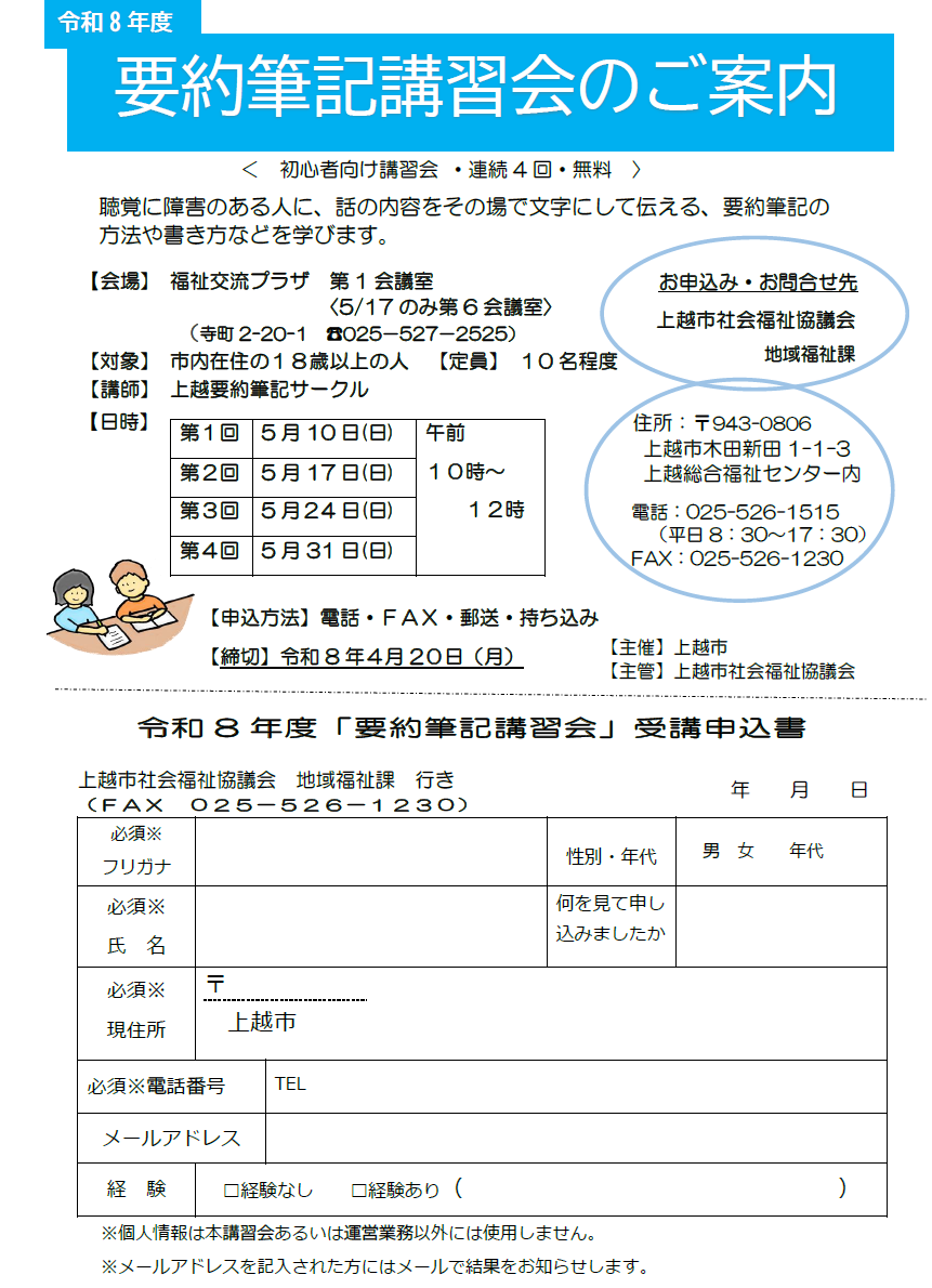 聴覚に障害のある人に、話の内容をその場で文字にして伝える、要約筆記の方法や書き方などを学ぶ初心者向けの講習会です。参加費無料。日時/5月10日②5月17日③5…続きを読む