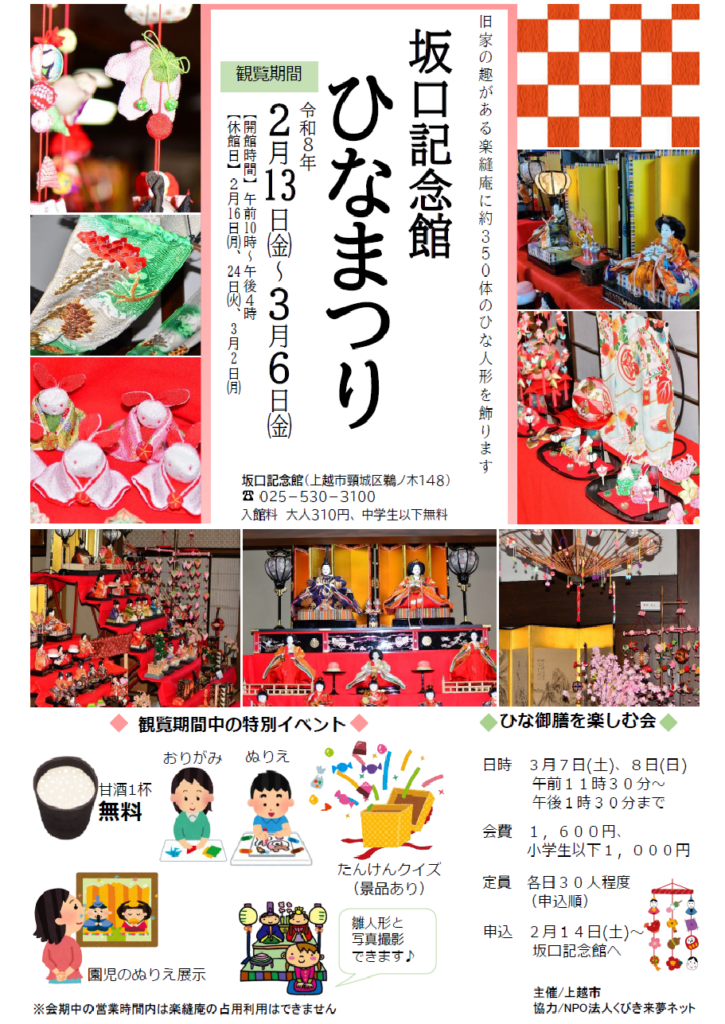 申込み問合せ/坂口記念館(上越市頚城区鵜ノ木148番地)025-530-3100