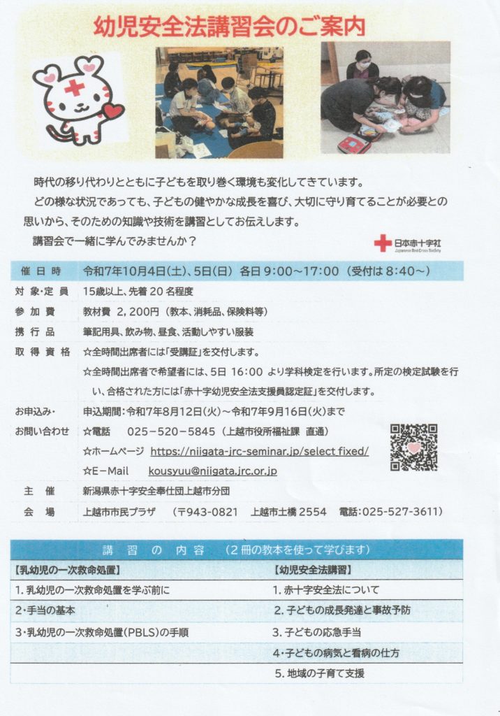 取得資格/全時間出席者には「受講証」交付、希望者は、5日午後4時より学科検定を行います。合格された方には「赤十字幼児安全法支援員認定証」を交付します。