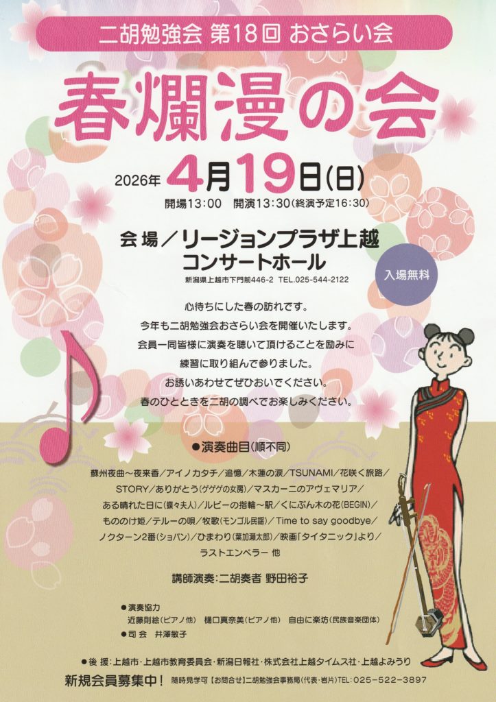 春爛漫の会 二胡勉強会おさらい会 4/19【更新日3/23】