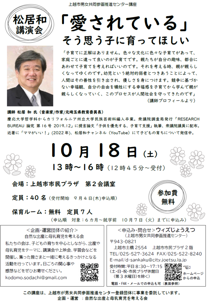 松居和講演会「愛されている」そう思う子にそだってほしい 10/18【更新日9/6】
