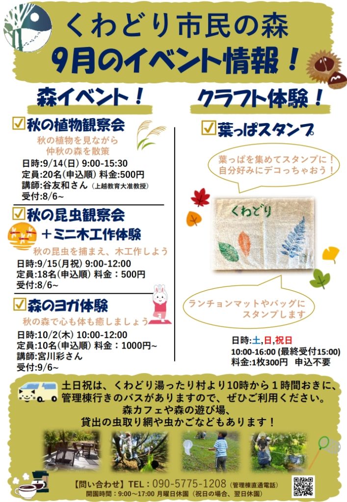 申込み・問合せ/くわどり市民の森【電話】090-5775-1208(管理棟直通電話)