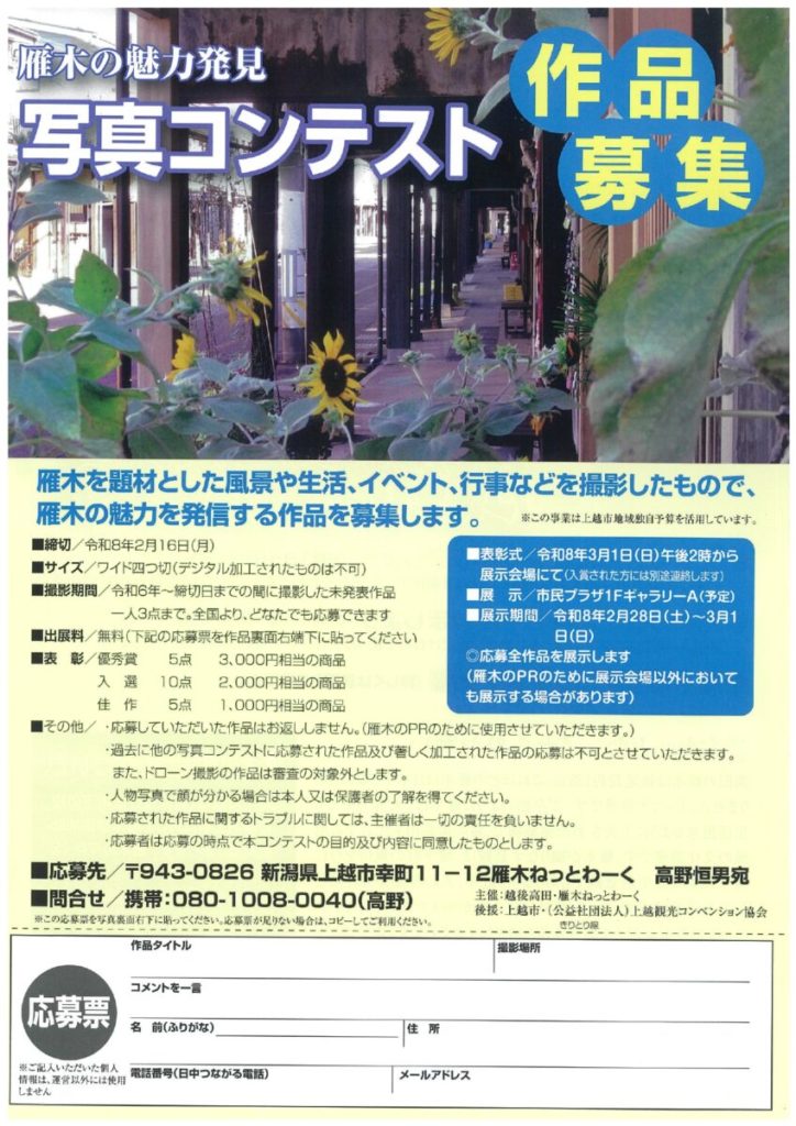 応募先/〒943-0826 上越市幸町11-12 雁木ねっとわーく 高野恒男宛