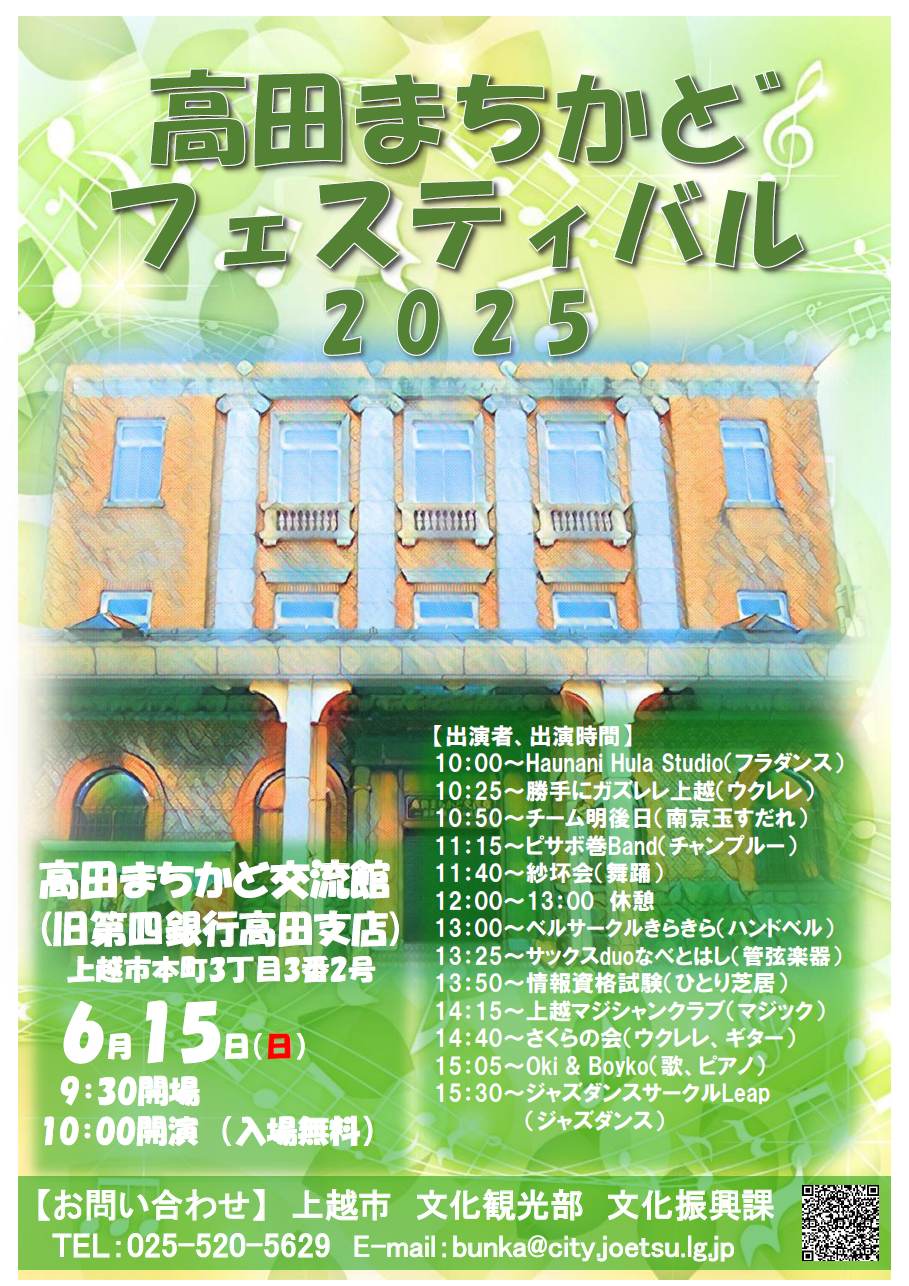 音楽や踊りなどの活動に取り組む個人・団体などが発表します。入場無料。日時/6月15日 午前10時~ 9時30分開場場所/高田まちかど交流館(上越市本町3)問合…続きを読む