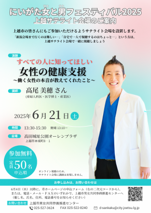 新潟県女性財団が、にいがた女(ひと)と男(ひと)フェスティバル2025講演会を開催します。 市では、高田城址公園オーレンプラザにオンラインで視聴するサテ…続きを読む