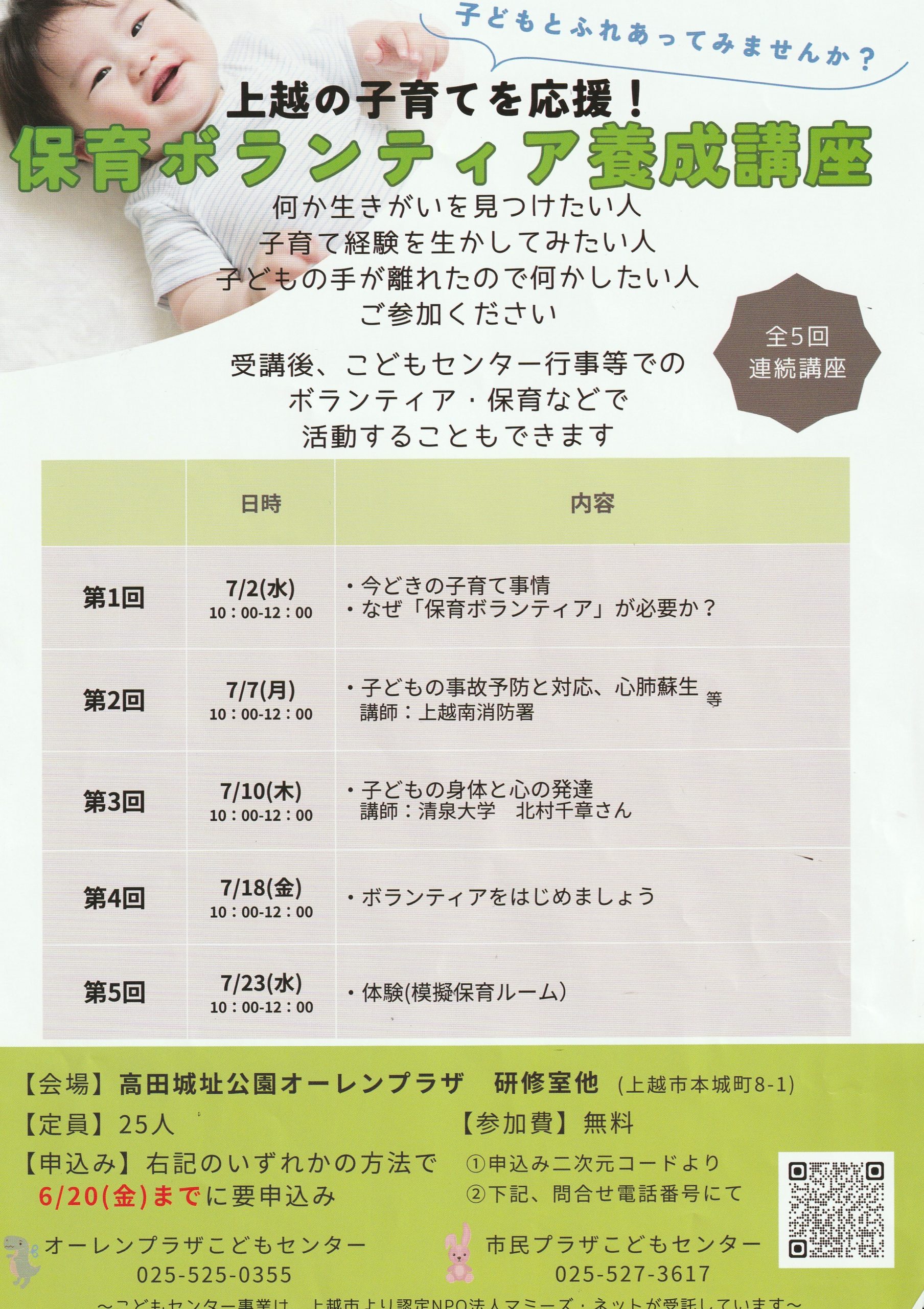 上越の子育てを応援する保育ボランティアについて学びます。受講後、こどもセンター行事などでのボランティア・保育などで活動することもできます。参加費無料。 …続きを読む
