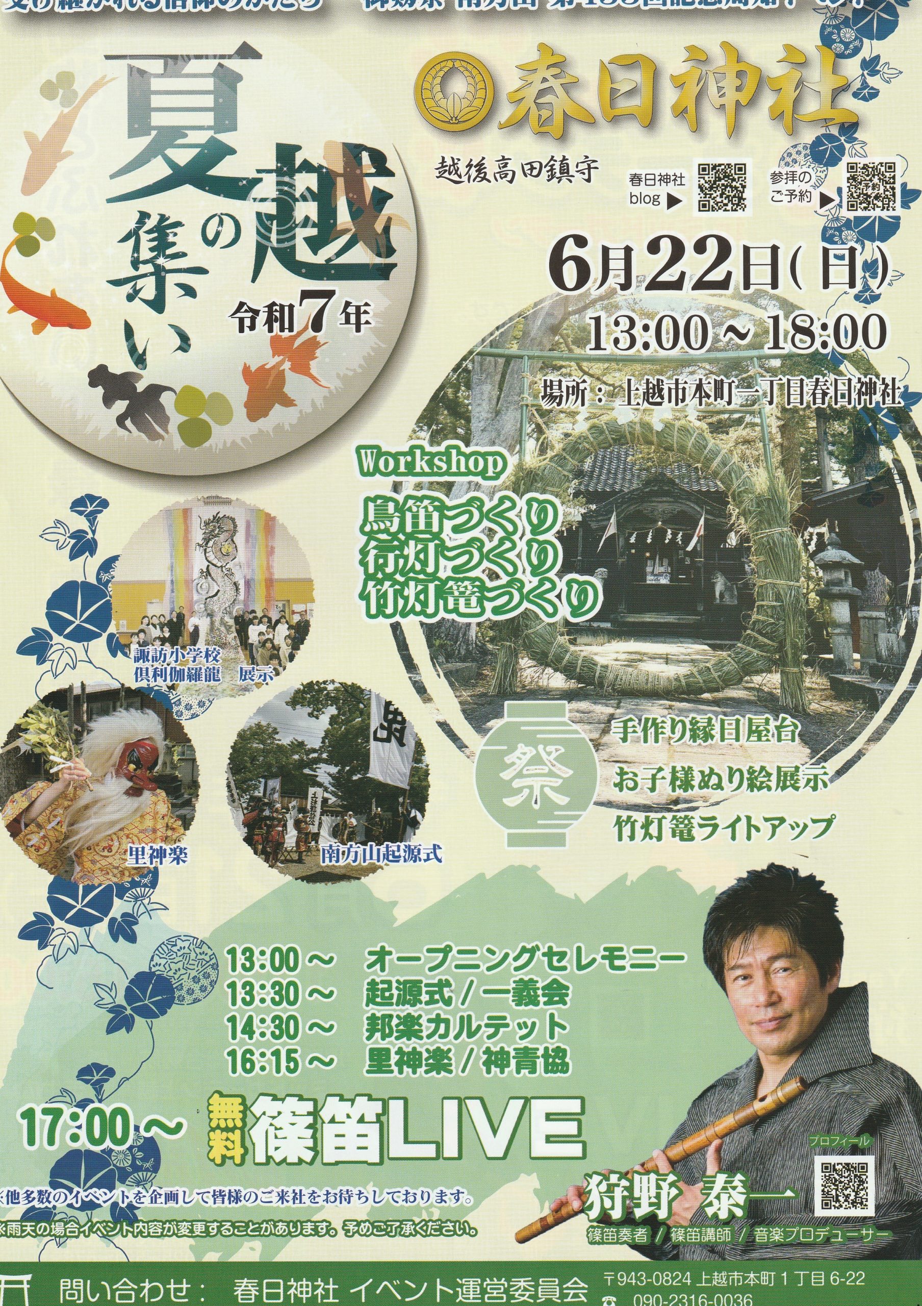 春日神社にて、夏越の集いが行われます。篠笛奏者の狩野泰一氏の篠笛LIVEをはじめ、多数のイベントやワークショップを企画して皆様のご来社をお待ちしております。 …続きを読む