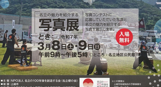 写真コンテストに応募された写真と名立の魅力を紹介する写真を展示します。入場無料。日時/3月8日、9日 午前9時~午後5時場所/上越市名立地区公民館問合せ/NP…続きを読む