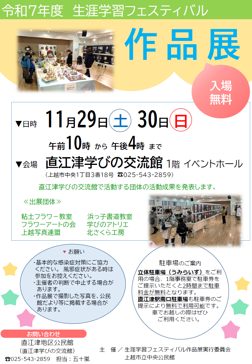 直江津学びの交流館で活動する団体が盛夏を発表します。日時/11月29日・30日 午前10時~午後4時場所/直江津学びの交流館 1階イベントホール出展団体/粘土…続きを読む