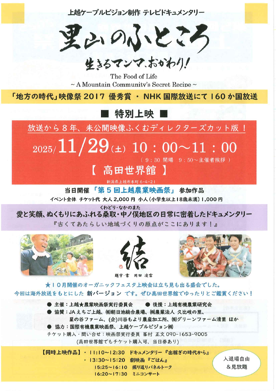 2017年製作の桑取谷のドキュメンタリー「里山のふところ」が「第5回上越農業映画祭」にて再び上映。再編集により、新バージョンの映像を上映します。日時/ 11月…続きを読む