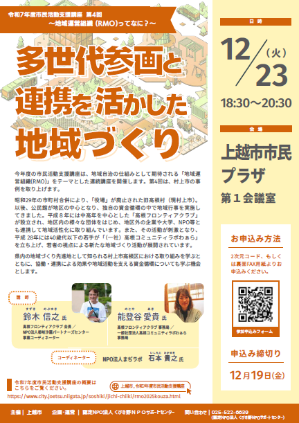 地域自治の仕組みとして期待される「地域運営組織(RMO)」をテーマとした連続講座を開催します。第4回は、村上市の事例を取り上げます。 内容・テーマ/ …続きを読む