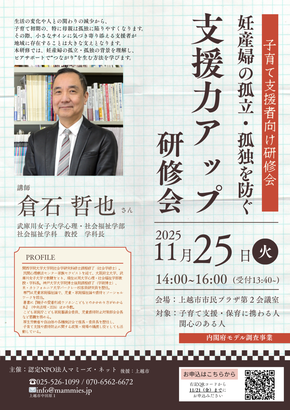 妊産婦の孤立・孤独を防ぐ支援力アップ研修会。講師の倉石哲也さんから、ピアサポートでつながりを生む方法を学びます。日時/11月25日(火)14:00~16:00…続きを読む