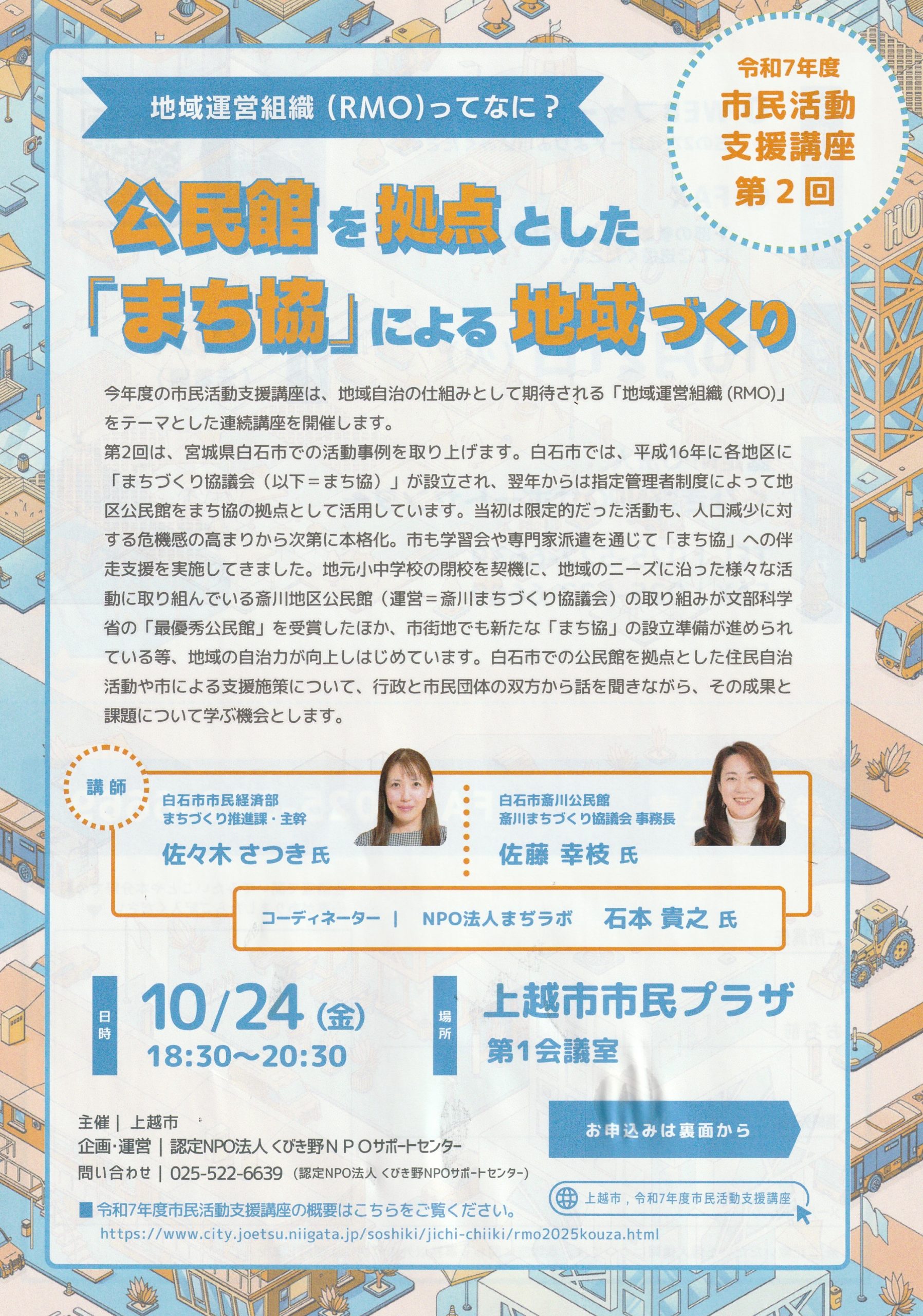 今年度の市民活動支援講座は、地域自治の仕組みとして期待される「地域運営組織 (RMO)」をテーマとした連続講座を開催します。第2回は、宮城県白石市での活動事例…続きを読む