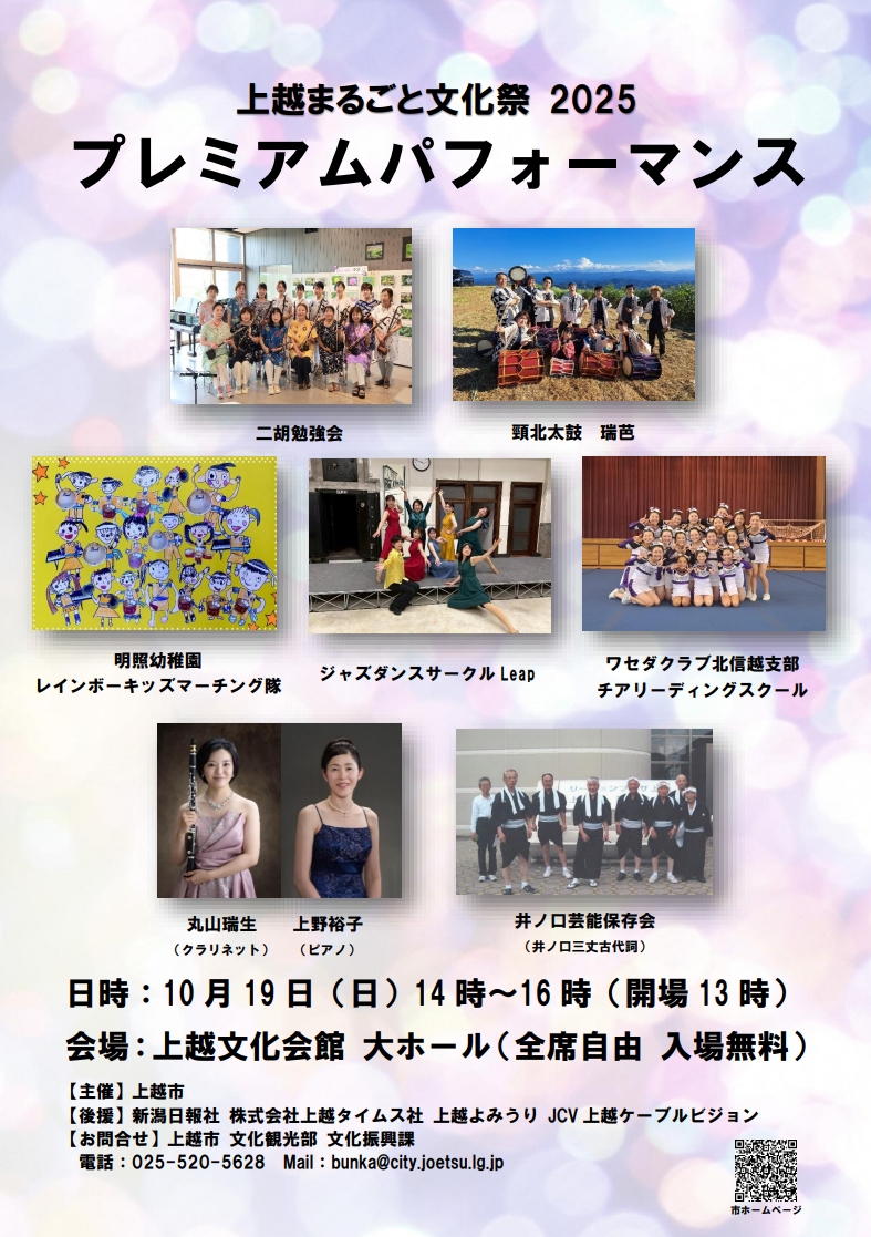 上越市内で活動団体がダンスや民俗芸能、合唱など、多彩なジャンルのパフォーマンスを披露します。日時/10月19日(日)14:00~16:00(開場13:00)会…続きを読む