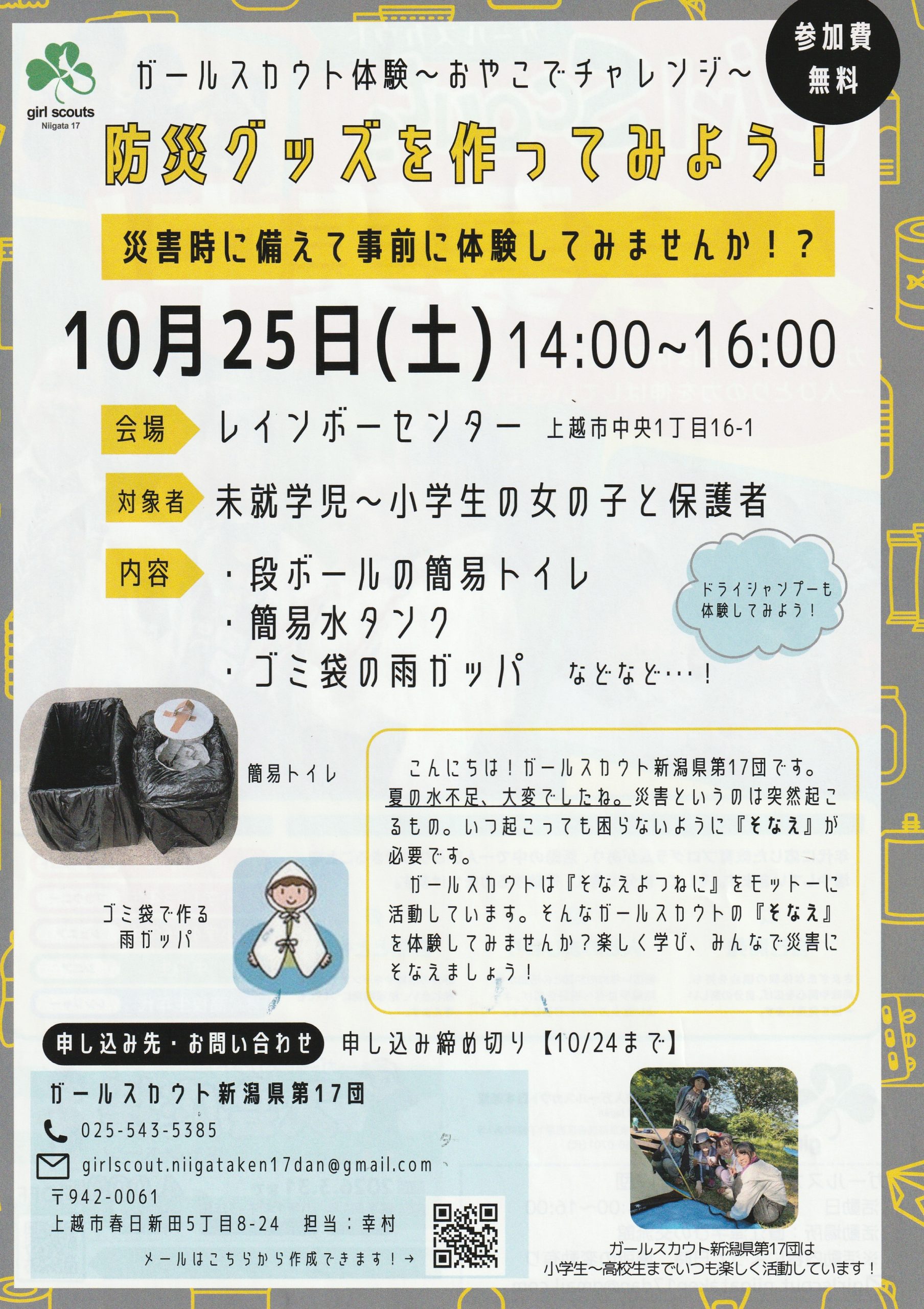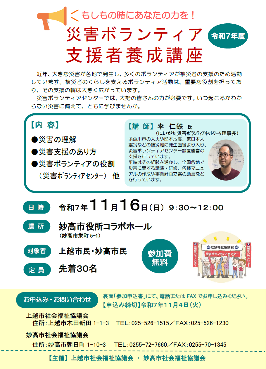 いつ起こるかわからない災害に備えて、被災者支援活動について学びます。参加費無料。日時/11月16日 午前9時30分~正午場所/妙高市役所コラボホール(妙高市栄…続きを読む