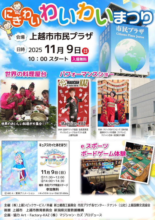 上越市市民プラザで開催する、年に一度の「にぎわい わいわいまつり」。マジックショーや世界の料理屋台、eスポーツ・ボードゲーム体験など、多彩なプログラムが行われ…続きを読む