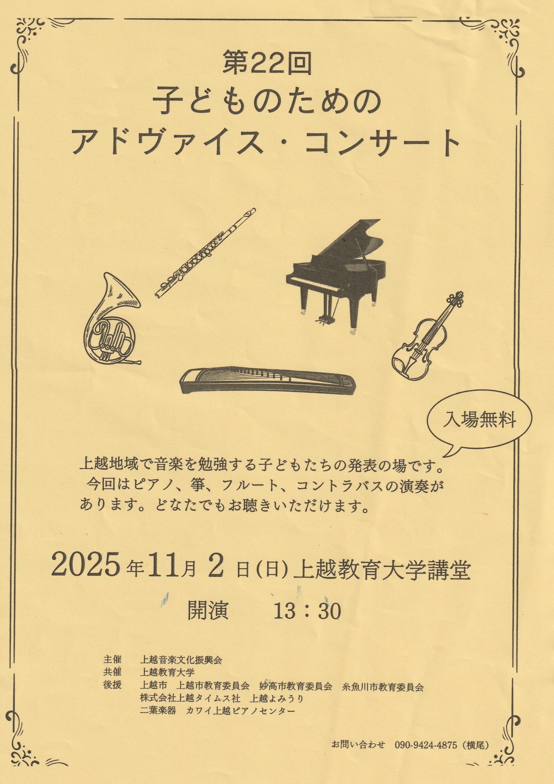 上越地域で音楽を勉強する子どもたちの発表の場です。今回はピアノ、箏、フルート、コントラバスの演奏があります。どなたでもお聴きいただけます。入場無料。 日…続きを読む