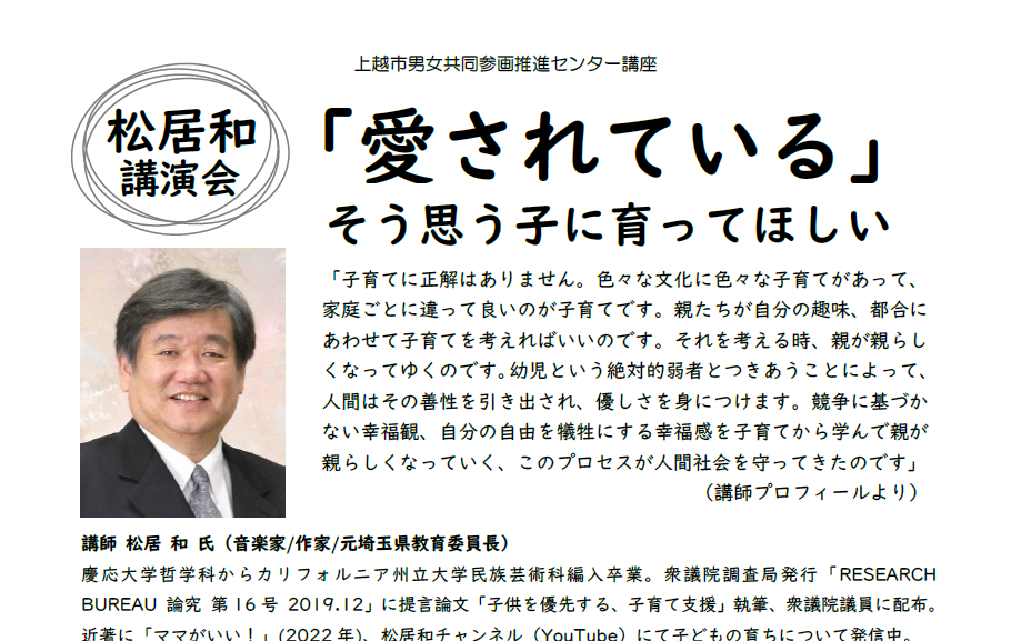 子育てにおける親と子の関わりについて学ぶ講座です。子どもの育ちについて様々な発信をされている松居和さんの話を聞いて、子育てに大切な「愛されること、愛すること、…続きを読む