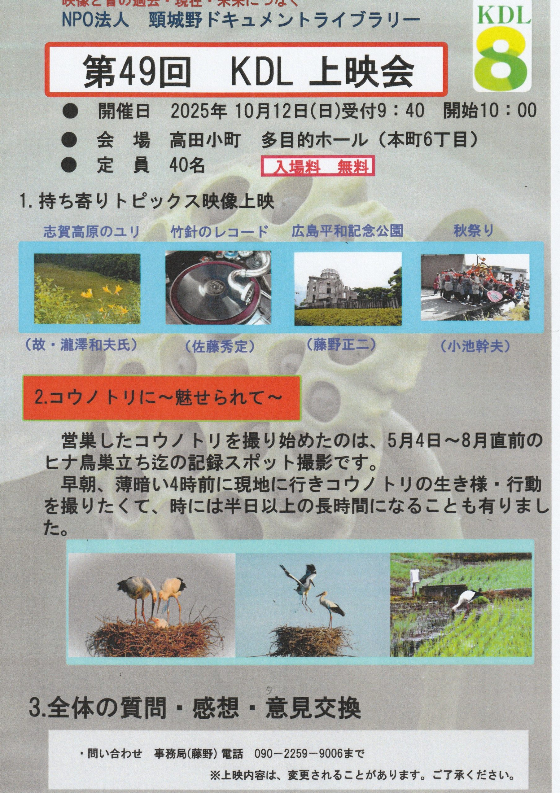 「持ち寄りトピックス映像」と、コウノトリに魅せられてを上映します。 日時/10月12日 午前9時40分(受付) 午前10時(開始)場所/高田小町 多目的…続きを読む