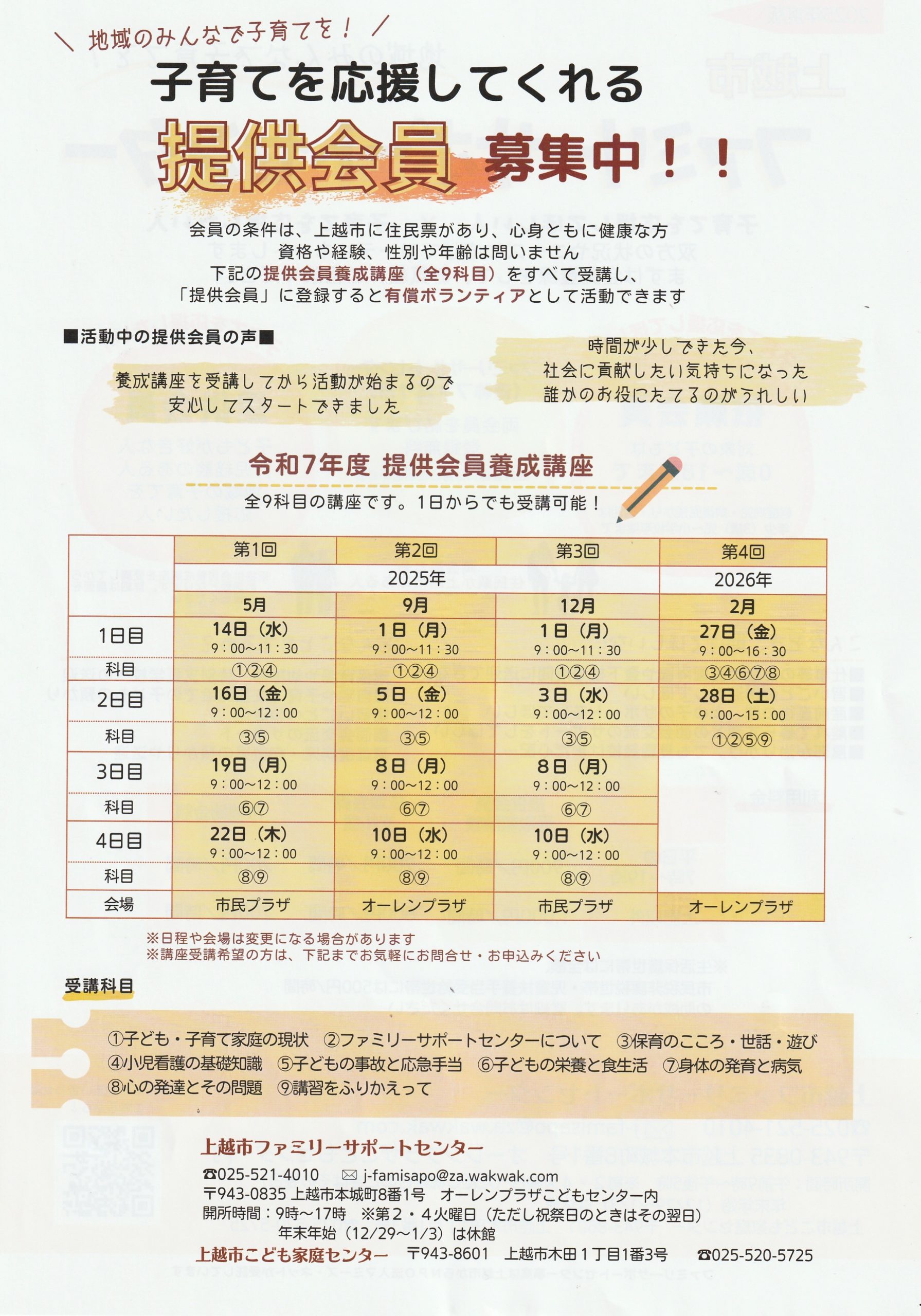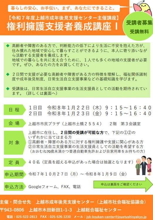 上越市成年後見支援センター主催による講座です。2日間で支援が必要な高齢者や障害がある方の権利擁護について学び、地域で活躍する支援者を養成します。地域での暮らし…続きを読む