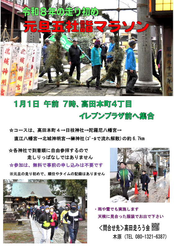 ジョギングをして高田地区の5神社を参拝します。イレブンプラザを出発し、日枝神社、陀羅尼八幡宮、直江八幡宮、北城神明宮、榊神社を巡って、約6.7km走ります。参…続きを読む