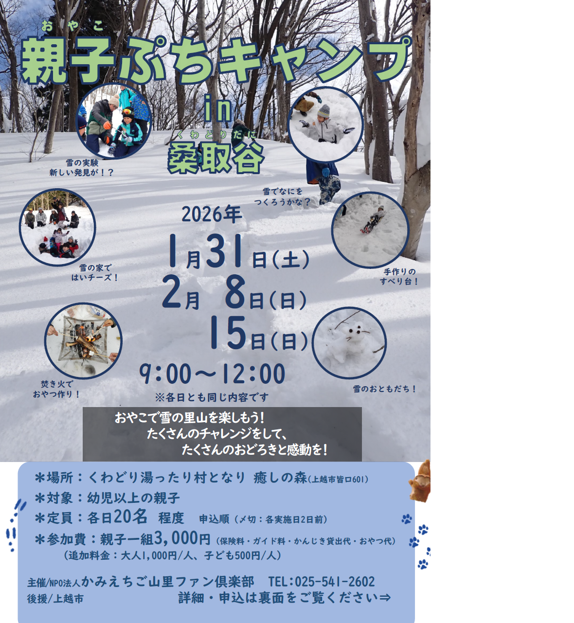 桑取谷で雪上散策や雪遊び、雪の実験、焚火体験など親子で楽しみます。日時/ 1月31日(土)、2月8日(日)、15日(日) 午前9:00~12:00 ※各日と…続きを読む