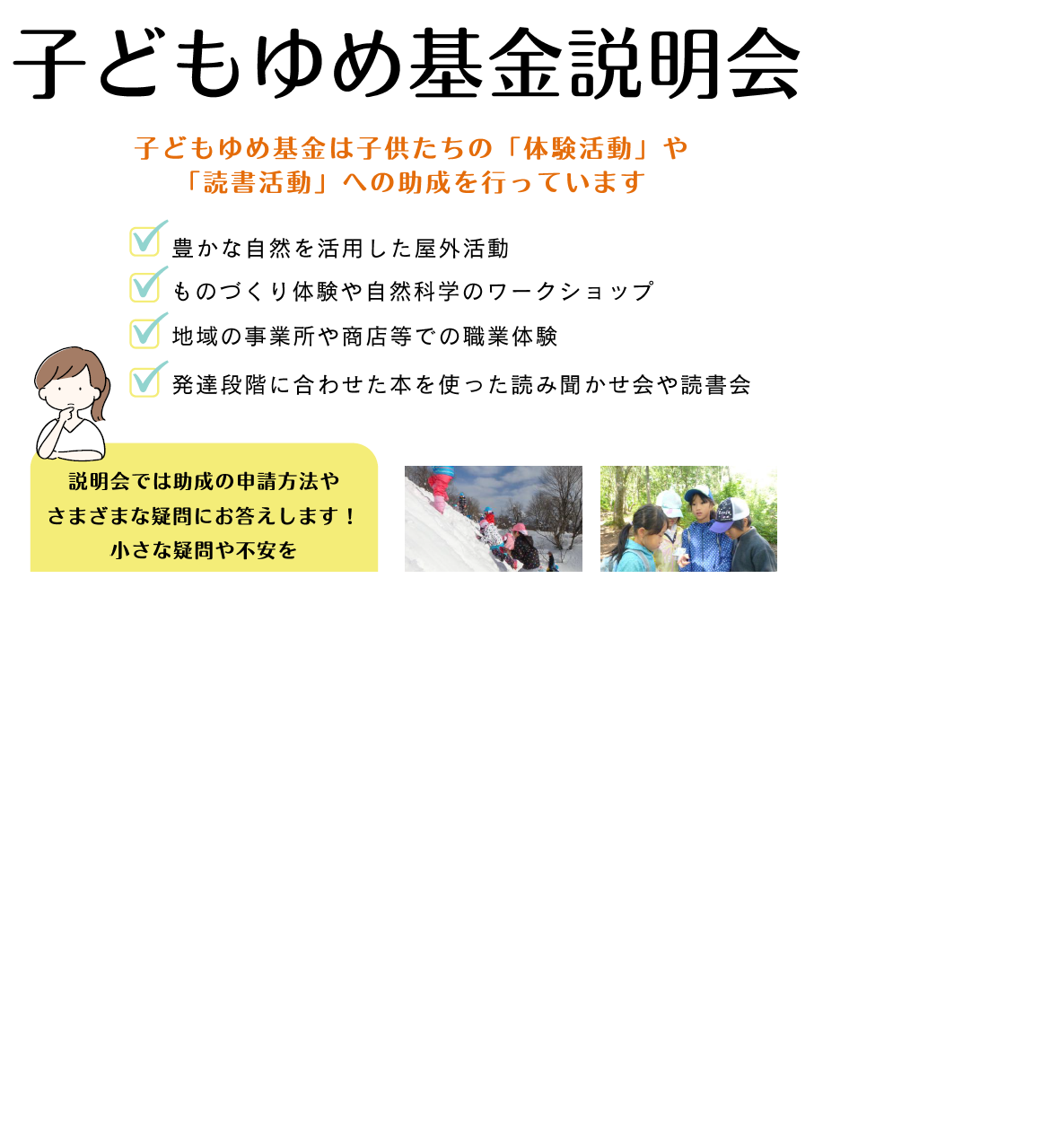 子どもの体験・読書活動などを応援し、子どもの健全育成の手助けをすることを目的とした「子どもゆめ基金」について、助成活動や助成の申請方法などの説明会を行います。…続きを読む
