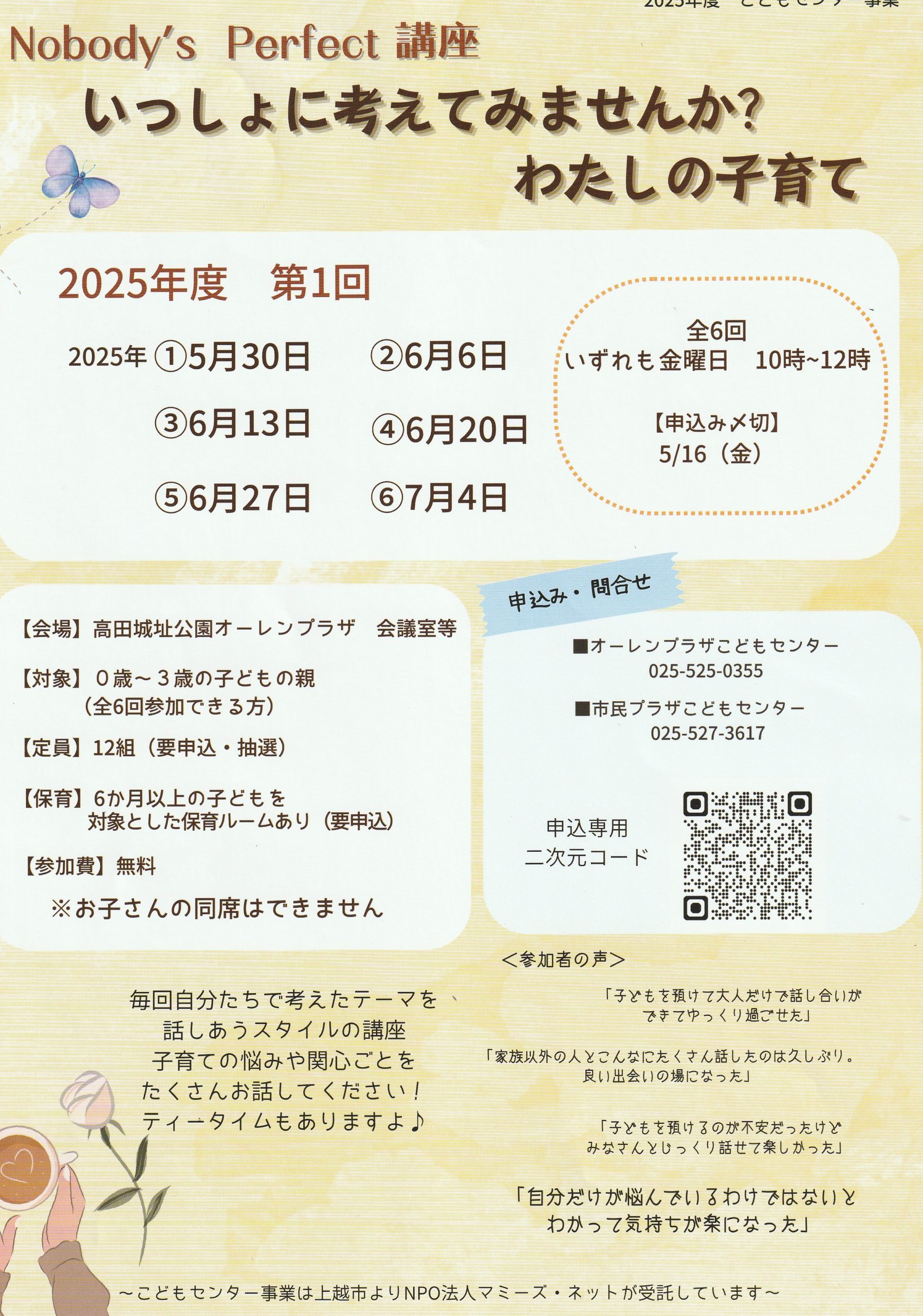 子育ての悩みや関心ごと等、毎回自分たちで考えたテーマを話しあうスタイルの講座です。日時/5月30日、6月6日、13日、20日、27日、7月4日 午前10時~正…続きを読む