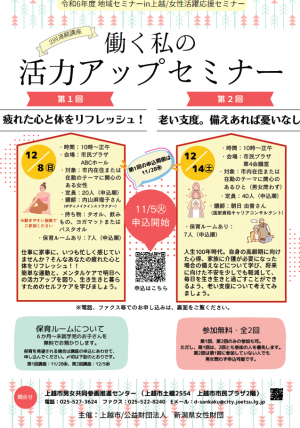 仕事や家事に忙しい毎日を過ごす女性を中心に、明日への活力アップを応援するセミナーです。 内容/(全2回。第1回または第2回のみの参加もOK。ただし、第1…続きを読む