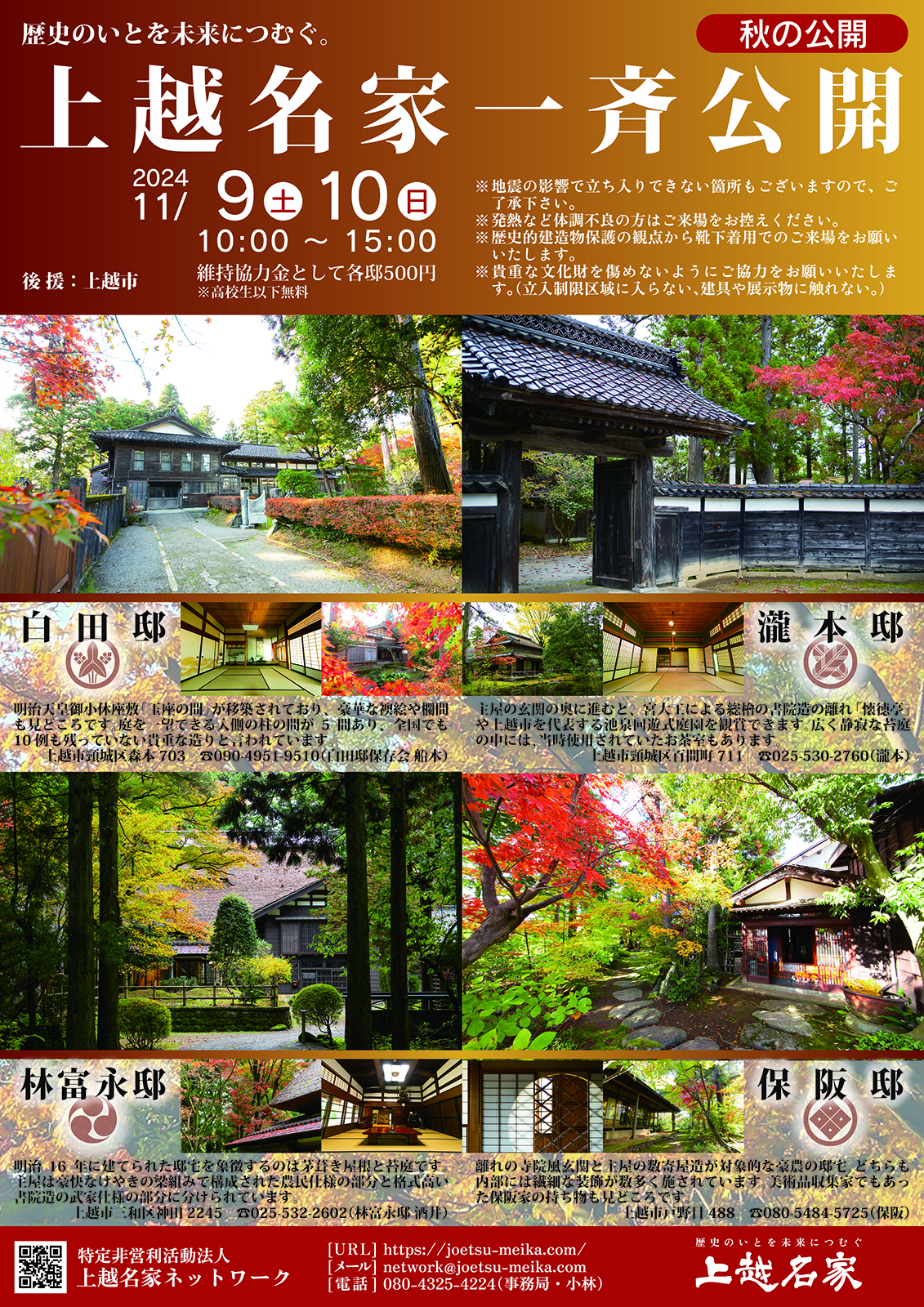 上越市内の歴史的旧家4邸を公開します。紅葉の庭園や各邸の秋の風情を味わうことができます。公開日/11月9日、10日 午前10時~午後3時維持協力金/各邸500…続きを読む