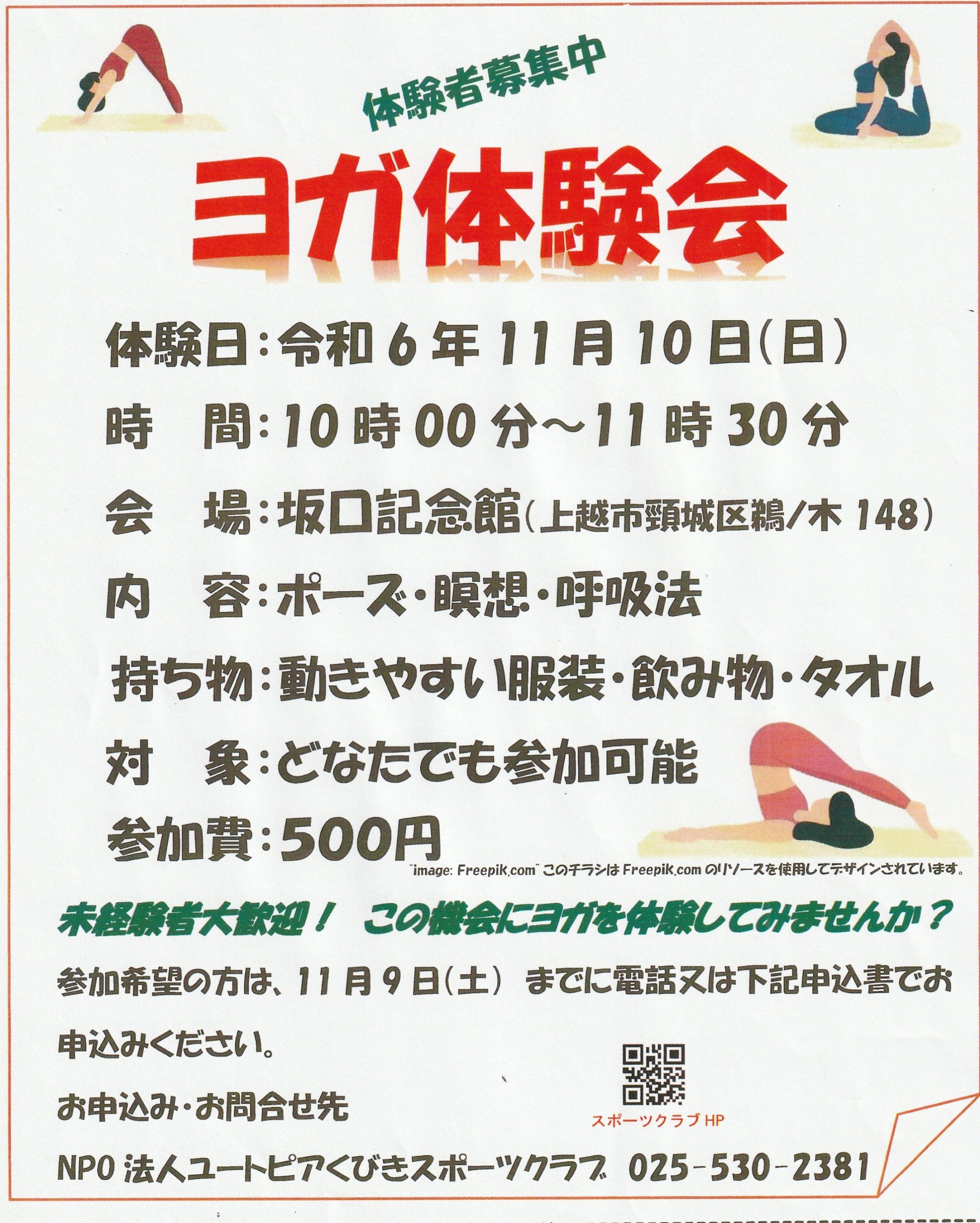 坂口記念館を会場にヨガ体験会を開催します。未経験者大歓迎です。 日時/11月10日(日)10時00分~11時30分 場所/坂口記念館(上越市頸城区…続きを読む