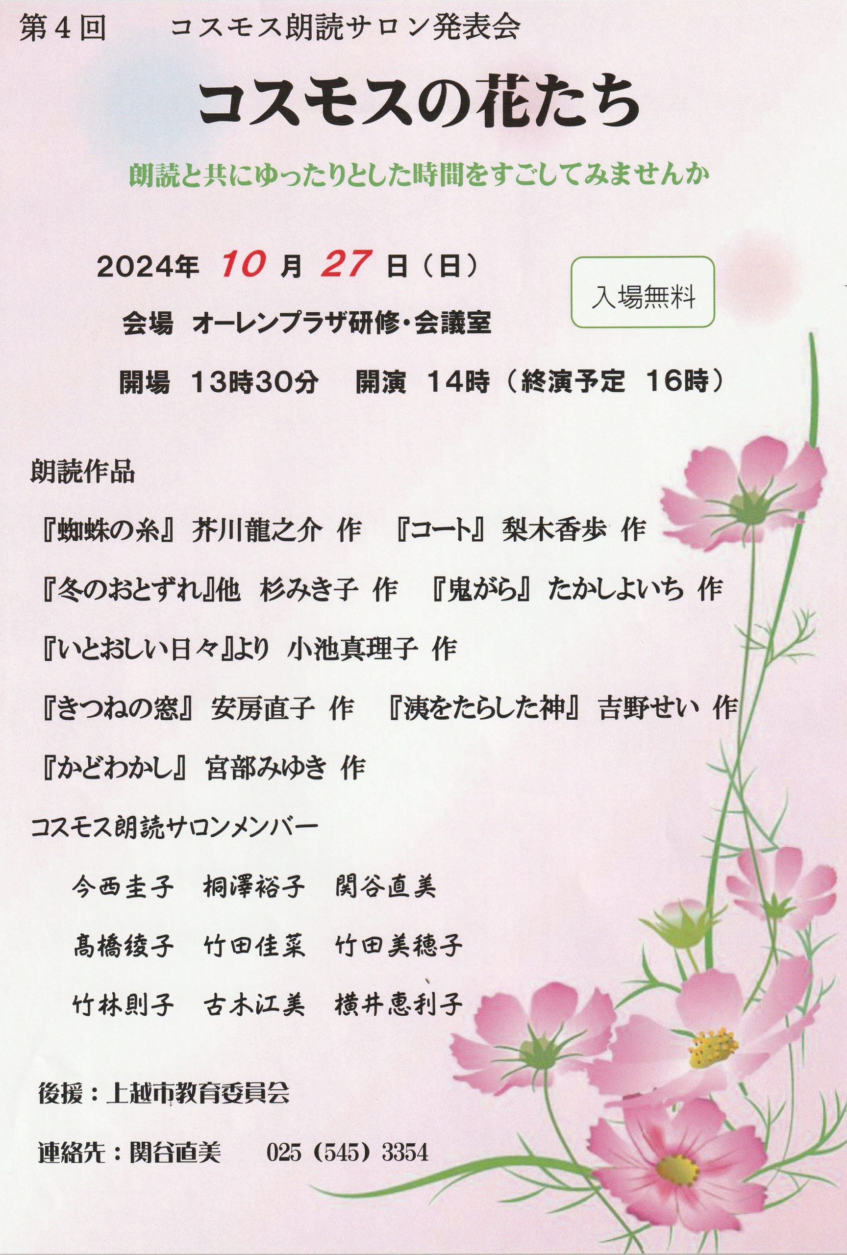 コスモスの花たち、メンバーが物語を朗読します。入場無料。日時/10月27日 午後2時~4時場所/オーレンプラザ研修・会議室(上越市本城町)朗読作品/蜘蛛の糸金…続きを読む