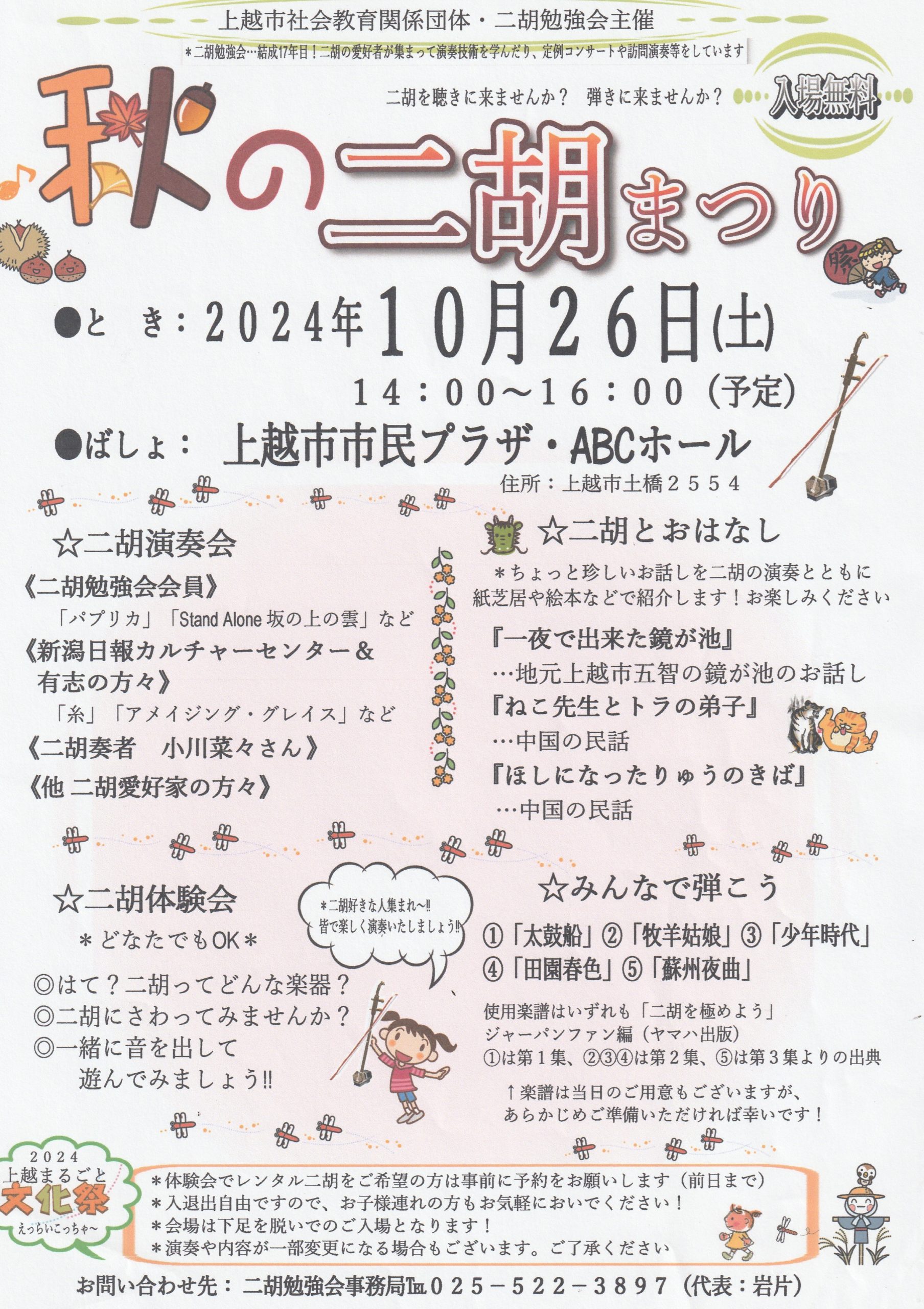 二胡のミニコンサートや全員合奏、無料体験会を行います。入場無料。日時/10月26日 午後2時~4時場所/上越市市民プラザ ABCホール二胡演奏会、二胡とおはな…続きを読む