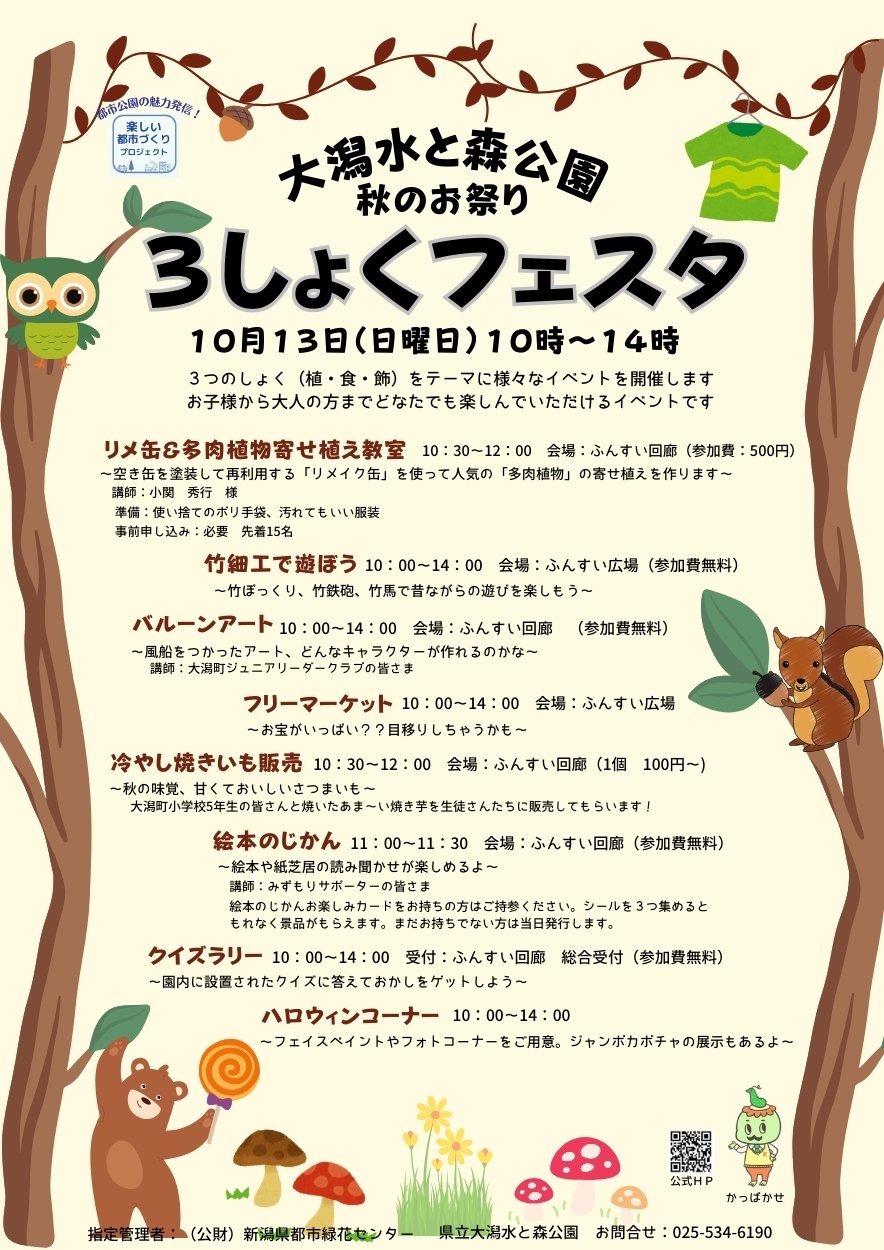 「しょく(植・食・飾)」をテーマに様々なイベントを行います。日時/10月13日 午前10時~午後2時場所/大潟水と森公園(上越市大潟区潟町)内容/竹細工遊びコ…続きを読む