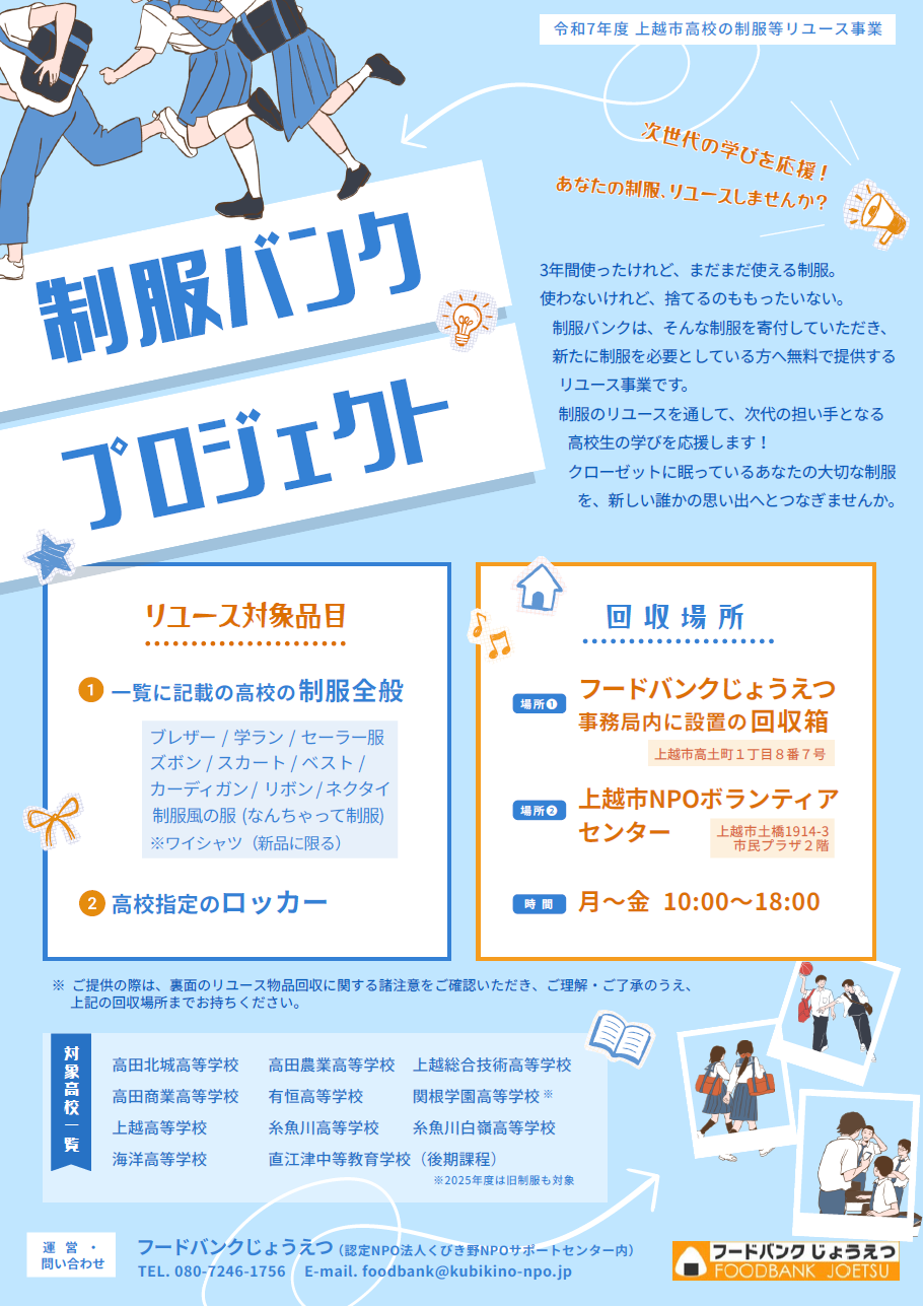 上越地域を中心に未利用食品や寄付を集め、必要とする人に提供している「フードバンクじょうえつ」を運営する認定NPO法人くびき野NPOサポートセンターでは、高校の…続きを読む